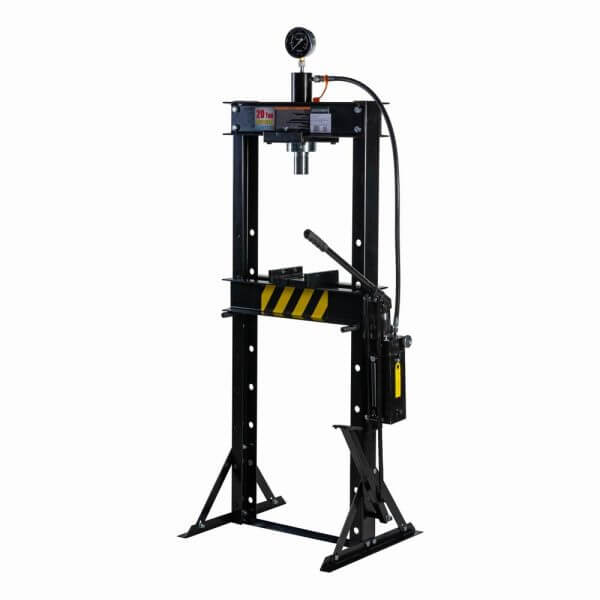 Гидравлический напольный пресс с усилием 20 тонн. Оснащен манометром, ручным гидравлическим приводом и педалью. Предусмотрена регулировка рабочей платформы по высоте.