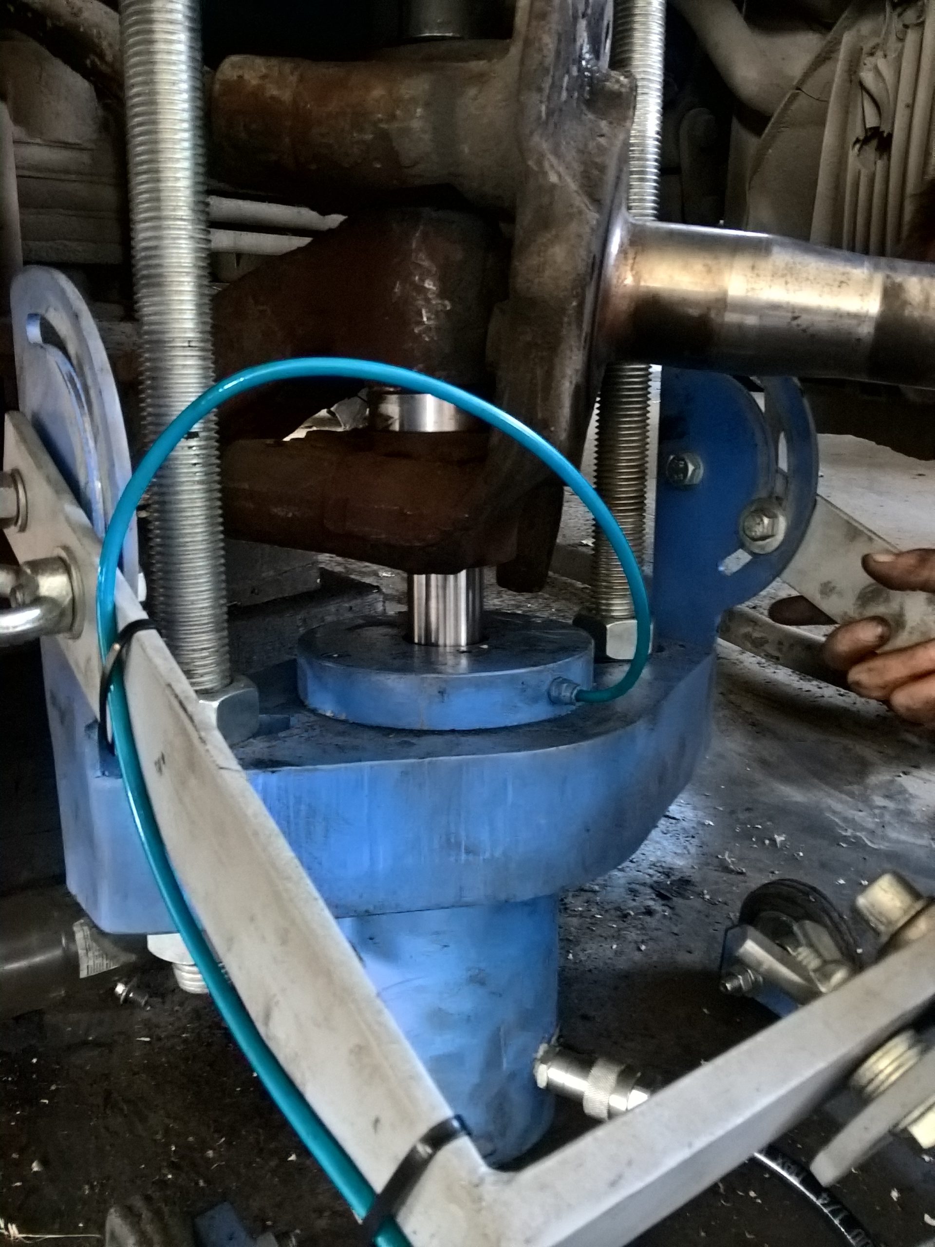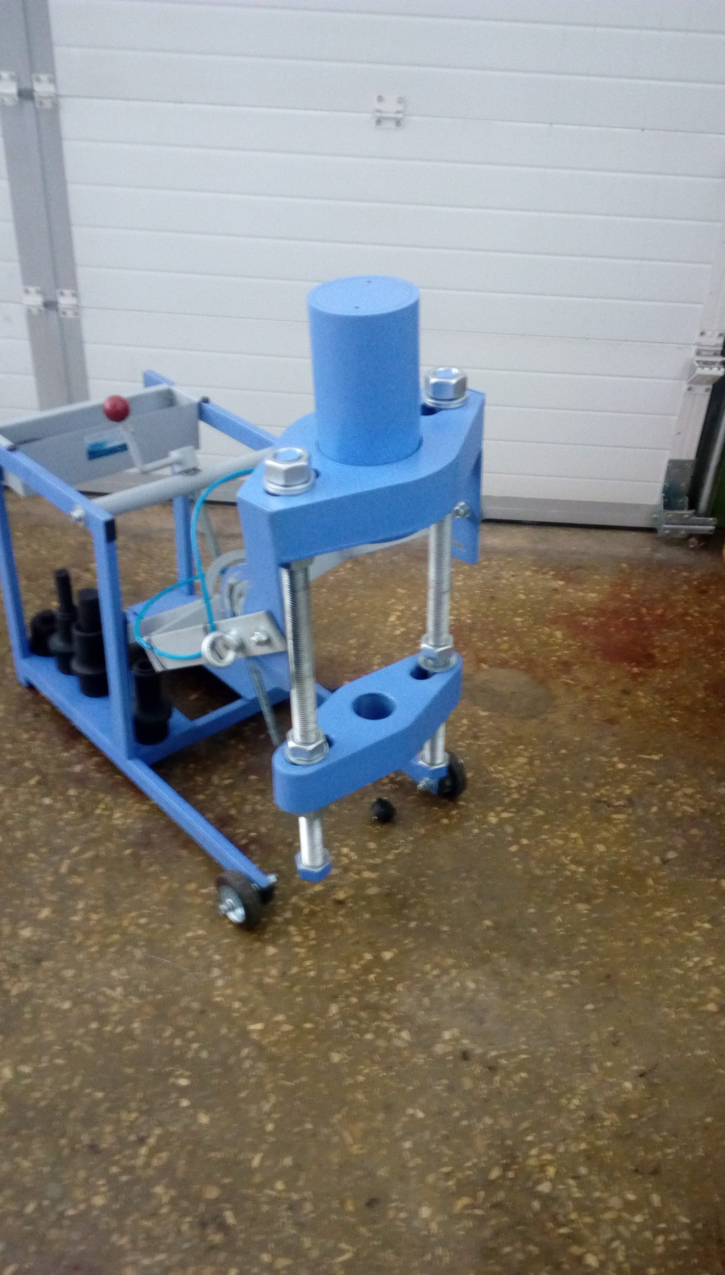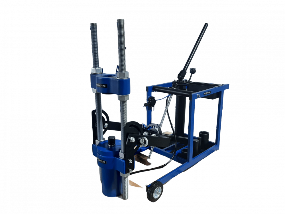 Одним из основных плюсов выпрессовщика ВШ70-200 с тележкой является возможность быстрой и безопасной работы. Шарнирно-закрепленная траверса с рабочим цилиндром позволяет поворачивать гидроцилиндр в любое требуемое положение. Использование винтовой тяги дает возможность устанавливать цилиндр под любым углом, что значительно увеличивает удобство в работе. Прорезиненные колесики диаметром 100 мм и поперечное перемещение колесиков до 10 мм обеспечивают легкость позиционирования выпрессовщика относительно шкворня.
