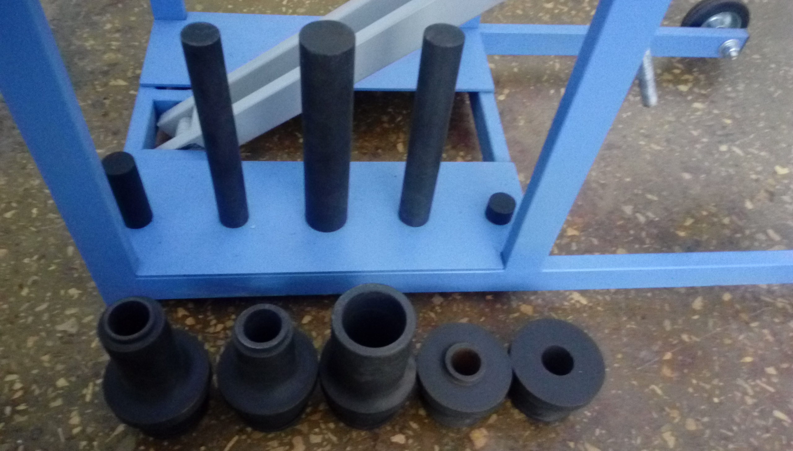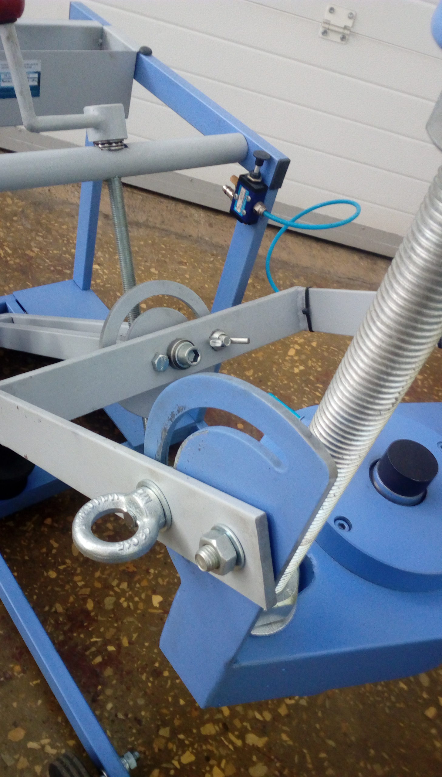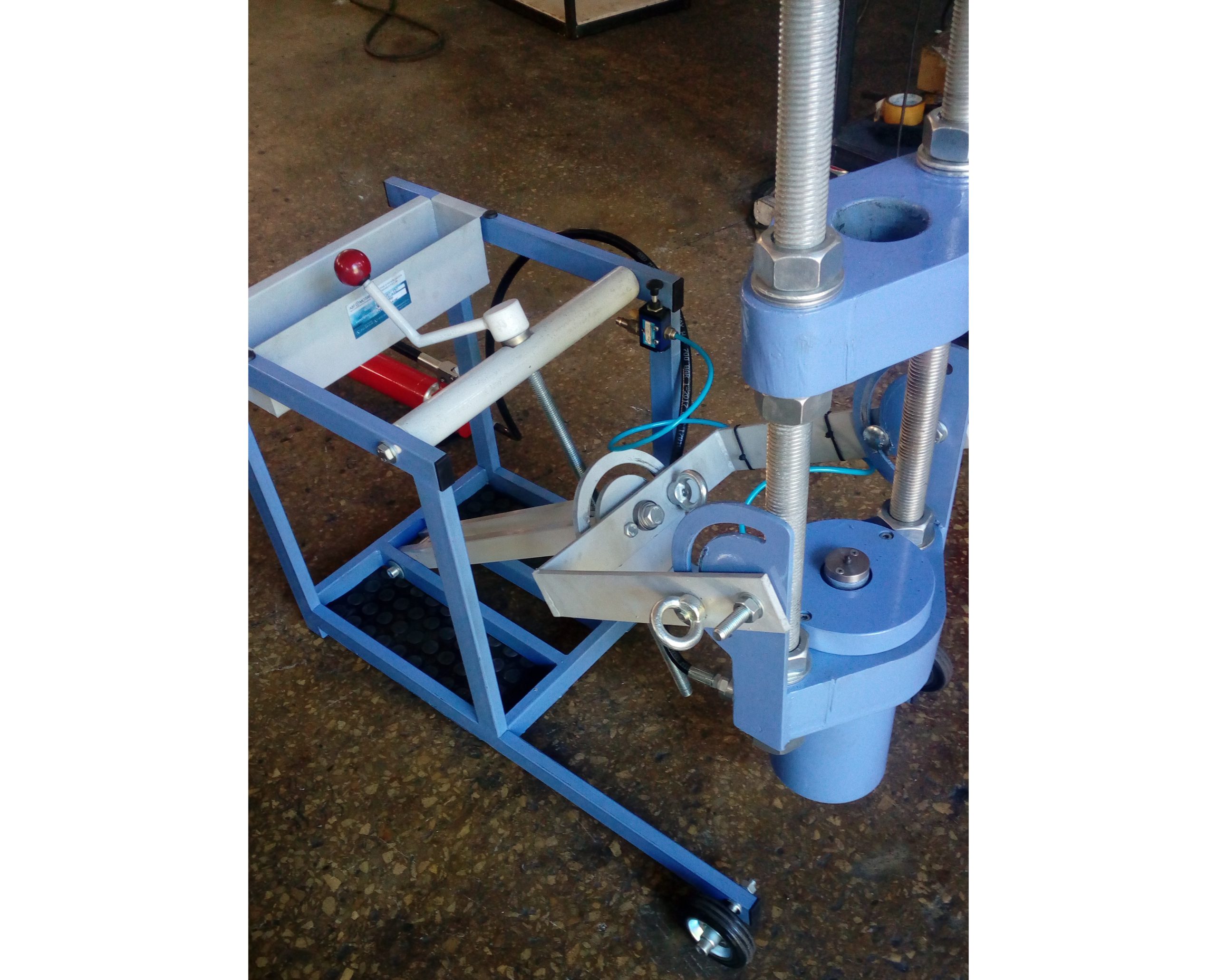 Одним из основных плюсов выпрессовщика ВШ70-200 с тележкой является возможность быстрой и безопасной работы. Шарнирно-закрепленная траверса с рабочим цилиндром позволяет поворачивать гидроцилиндр в любое требуемое положение. Использование винтовой тяги дает возможность устанавливать цилиндр под любым углом, что значительно увеличивает удобство в работе. Прорезиненные колесики диаметром 100 мм и поперечное перемещение колесиков до 10 мм обеспечивают легкость позиционирования выпрессовщика относительно шкворня.