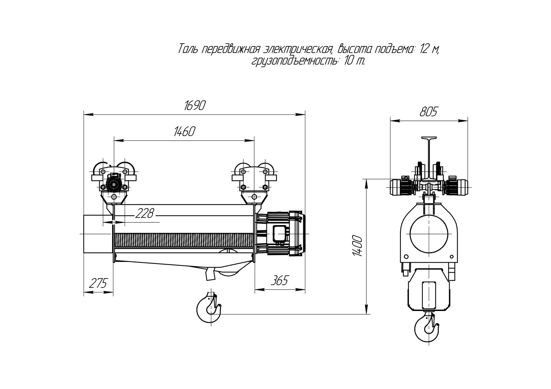Передвижная электрическая канатная таль ТЭ 1000 грузоподъемностью 10000кг оснащена кареткой передвижения с электроприводом. Таль предназначена для подъема, удержания и опускания различных грузов а также для горизонтального перемещения грузов вдоль монорельсового пути двутаврового профиля.
