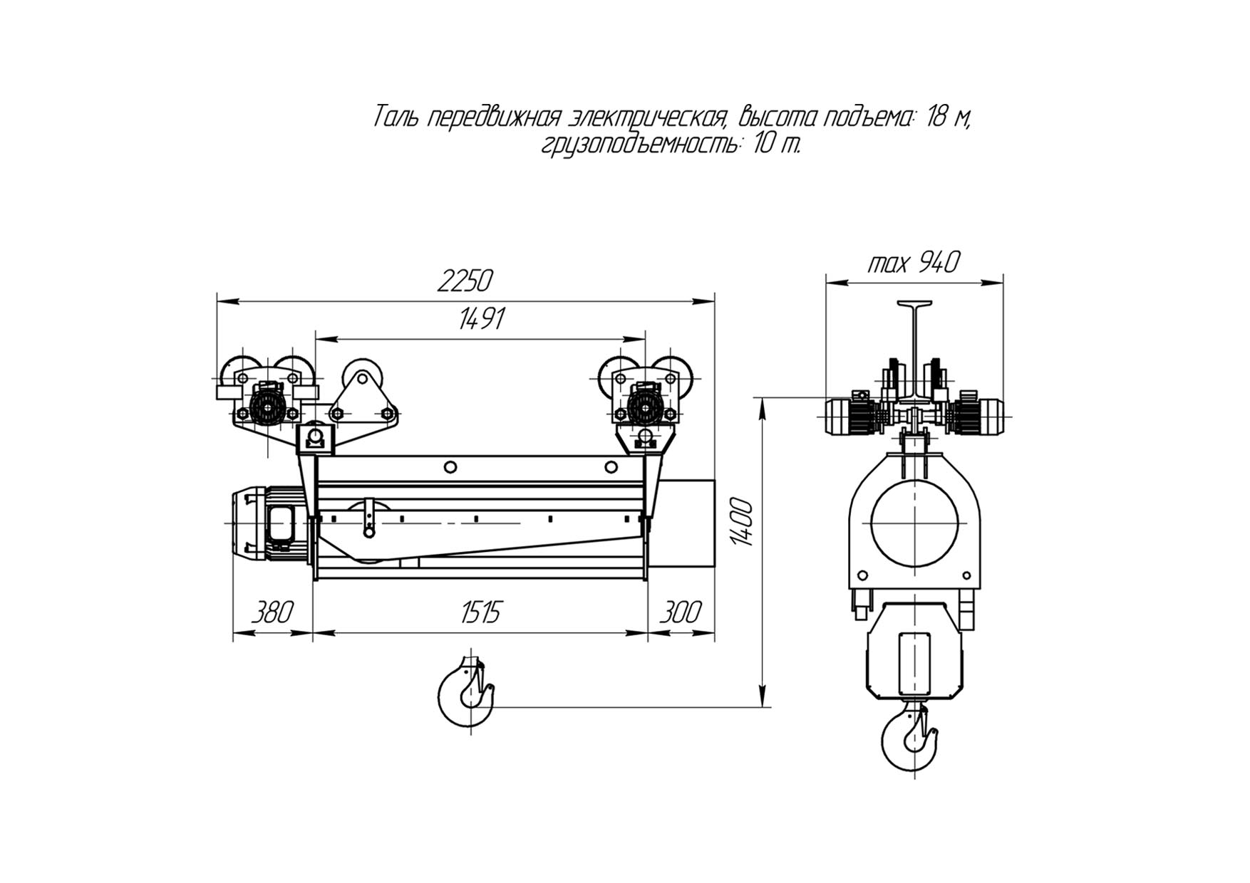 Передвижная электрическая канатная таль ТЭ 1000 грузоподъемностью 10000кг оснащена кареткой передвижения с электроприводом. Таль предназначена для подъема, удержания и опускания различных грузов а также для горизонтального перемещения грузов вдоль монорельсового пути двутаврового профиля.