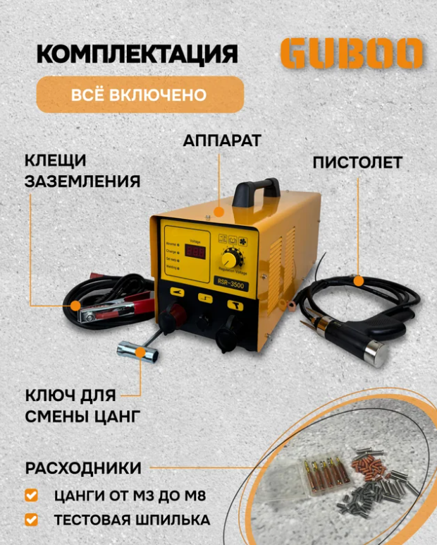 - Диапазон привариваемого крепежа: М3-M10 или Ø 3-10 мм, сталь и нержавеющая сталь, алюминий