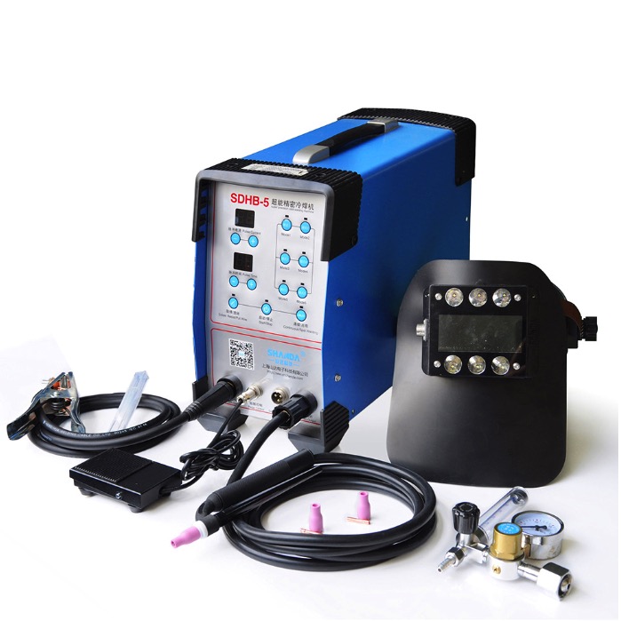 Высокоточный аппарат холодной сварки SDHB-5. Имитация лазерной сварки. Применяется для соединения деталей из стали, меди т.д. Цифровой ЖК монитор позволяет отслеживать и настраивать параметры. Высокая мощность сварки, пятно сварки маленькое, нагрев материала минимальный, соответственно нет деформации изделия. Для запайки неровности на поверхности можно использовать разные припои толщиной от 0.5 мм до 1.6 мм. Сварка компактна и проста в использовании.