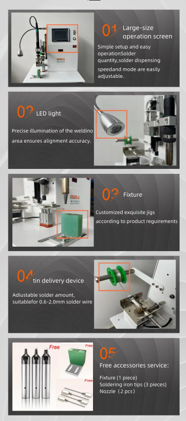Используется в пайке светодиодов, пайке печатных плат и других отраслях. В электронной промышленности автоматическая паяльная машина используется для пайки смешанных печатных плат, термочувствительных компонентов и чувствительных компонентов в процессе поверхностного монтажа (SMT). Машина для пайки коаксиальных проводов оснащена ПЛК с сенсорным экраном и высокоточным регулятором температуры, а также функцией продувки оловянным шлаком. Не требует специальных знаний в области пайки, с ней легко справятся даже новички.