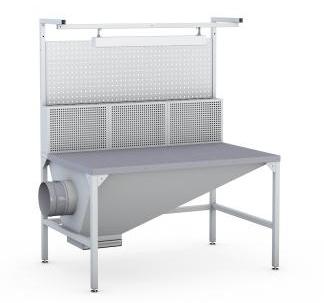 Конструкция шлифовально-зачистного стола предусматривает эффективное выведение образующихся в процессе работ пылевых смесей и твёрдых частиц, образуемых при работе с абразивами. Для этого в конструкции стола предусмотрены фронтальная перфорированная вытяжная панель и столешница.. Каркас сварной, столешница из оцинкованного перфорированного листа толщиной 2 мм. Вытяжное устройство регулируется дроссель-клапаном с ручным управлением. Стол оборудован светодиодным светильником на стойках и перфорированным экраном. На дне вытяжки установлен выдвижной лоток для сбора пыли. Ножки стола на регулируемых опорах.