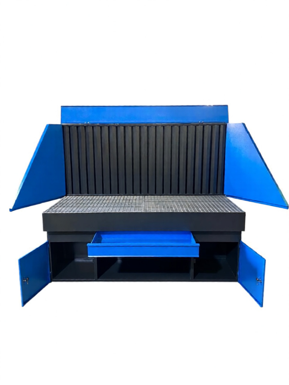 Надежная цельносварная стальная конструкция оборудована собирающим контейнером и выдвижным ящиком для сбора и удаления мелких отходов процесса зачистки, двумя тумбами с полками для хранения деталей и инструмента.