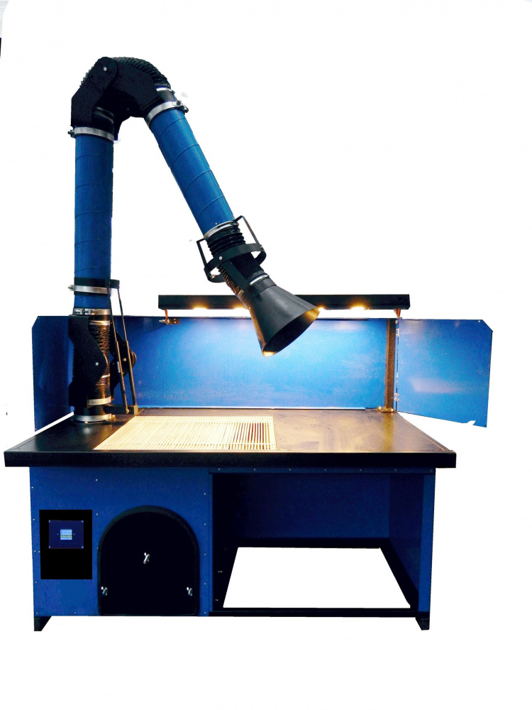 Отбор воздуха, загрязненного сварочным дымом и аэрозолями производится с помощью поворотно-вытяжного устройства, расположенного на рабочей поверхности сварочного стола. Использование поворотно-вытяжного устройства позволяет расширить функциональные возможности данного оборудования, обеспечивая локальную вытяжку как с рабочей поверхности стола сварщика, так и за его пределами.