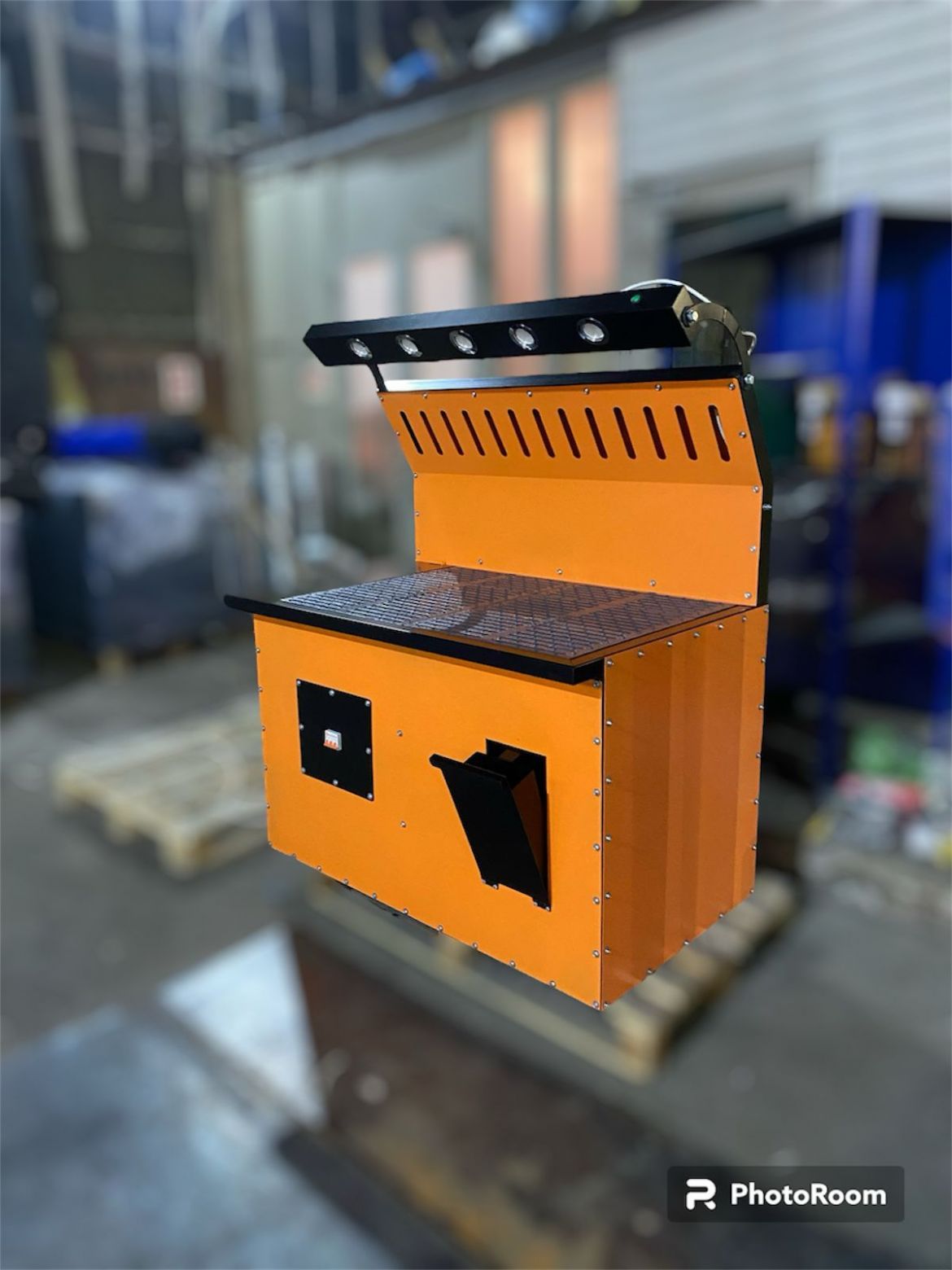 Воздух, загрязненный сварочным дымом и аэрозолями всасывается в вентиляционную решетку, расположенную под углом 45 град. к горизонтали в верхней части защитного экрана. Сверху, на защитном экране расположен светильник, обеспечивающий необходимую яркость для комфортной работы сварщика.
