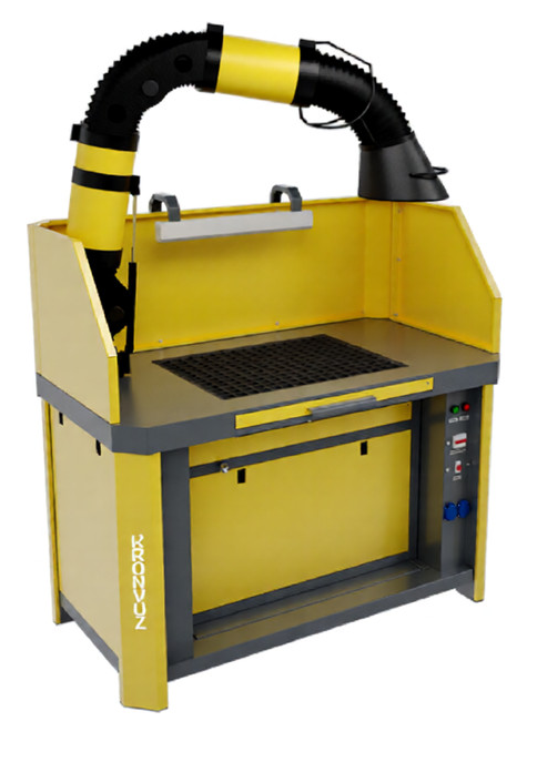 Вытяжной вентилятор вытягивает сварочные газы через верхнюю систему вентиляционных отверстий, что располагаются на экране изделия. Сварочные газы пропускаются через фильтр и заднее вентиляционное отверстие, а затем выводятся очищенными наружу. Внутри стола установлена наклонная перегородка, отсеивающая тяжелые частицы, попадающие в специальный ящик для сбора.