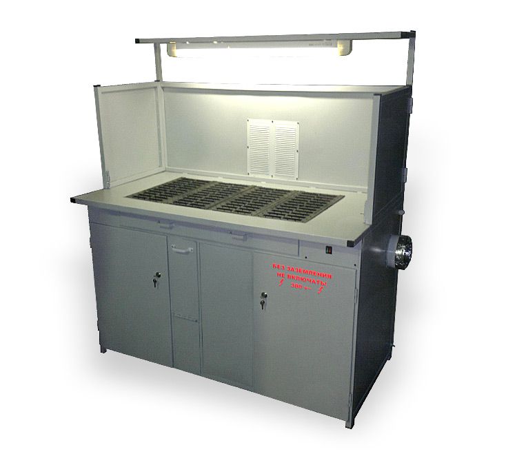 Стол сварщика предназначен для выполнения сварочных работ на производственных участках, цехах и в специально направленных учебных заведениях. Стол обеспечивает безопасную работу сварщика в специально установленном месте, повышает производительность и четкость в работе. Стол имеет особенность удаление вредных паров при помощи вытяжного устройство вентилятора. Едкий дым удаляется через чугунные решетки расположенные на столешнице. Конструктив стола сварщика: металлическая профильная труба обшита листом металла. Так же столы сварщика изготовляются по эскизам и размерам заказчика.