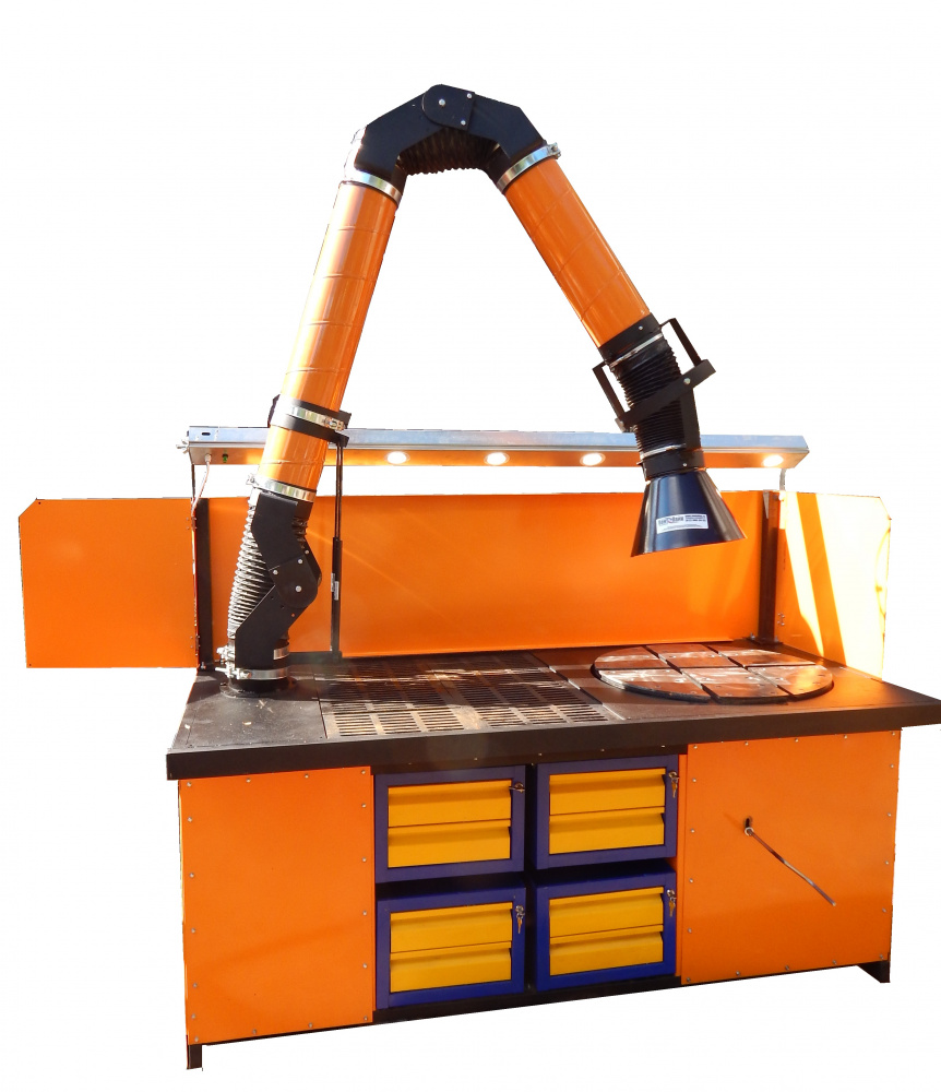 Отбор воздуха, загрязненного сварочным дымом и аэрозолями, производится с помощью поворотно-вытяжного устройства, расположенного на рабочей поверхности стола. Использование поворотно-вытяжного устройства позволяет расширить функциональные возможности данного оборудования, обеспечивая локальную вытяжку как с рабочей поверхности стола, так и за его пределами.