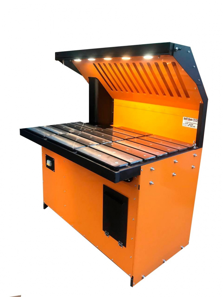 Воздух, загрязненный сварочным дымом и аэрозолями, всасывается в вентиляционную решетку, расположенную под углом 45 град. к горизонтали в верхней части защитного экрана. Сверху, на защитном экране расположен светильник, обеспечивающий необходимую яркость для комфортной работы сварщика.