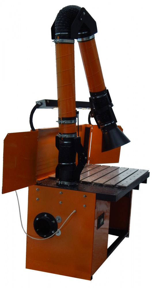 Стол сварщика ССТ-1250 ВНП состоит из каркаса, выполненного из профильной трубы 60х30х2, что создает необходимую прочность конструкции. Каркас обшит стальными листами толщиной 1,5 мм., покрытыми высококачественным порошковым напылением. Отбор воздуха, загрязненного сварочным дымом и аэрозолями производится с помощью поворотно-вытяжного устройства, расположенного на рабочей поверхности стола. Использование поворотно-вытяжного устройства позволяет расширить функциональные возможности данного оборудования, обеспечивая локальную вытяжку как с рабочей поверхности стола, так и за его пределами. Стол оборудован съемным экраном, причем боковые стенки экрана, имеющие гибкие соединения с центральной частью экрана, могут раскладываться, образуя единую плоскость с центральным экраном, или, наоборот, складываться к центру стола. Сверху, на защитном экране расположен светильник, обеспечивающий необходимую яркость для комфортной работы сварщика. Разряжение воздуха, необходимое для создания воздушного потока, проходящего через поворотно-вытяжное устройство, создается центробежным вентилятором, установленным на виброизоляторах и расположенным в корпусе стола. Соединение центробежного вентилятора с внешним воздуховодом осуществляется посредством гибкой вставки. Органы управления электрической частью стола расположены на его лицевой панели. Там же находится колчан для электродов.