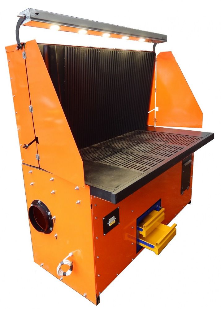 Стол сварщика предназначен для проведения на нем механической обработки поверхностей, такие как шлифовка и зачистка деталей, а также для сварочных работ. Отбор загрязненного воздуха осуществляется как через столешницу, состоящую из чугунных колосниковых решеток, так и через фронтальную стенку экрана, представляющую из себя панель равномерного всасывания. Центробежный вентилятор, с помощью которого создается разряжение воздуха, необходимое для создания воздушного потока, оборудован алюминиевым рабочим колесом оригинальной конструкции, что (по сравнению со стальным рабочим колесом, которое обычно используется в аналогичных изделиях) существенно улучшает шумовые характеристики оборудования, а также уменьшает пусковые токи электродвигателя. Кроме того, центробежный вентилятор имеет интегрированную систему шумоизоляции, позволяющую снизить уровень шума до 60 дБ.