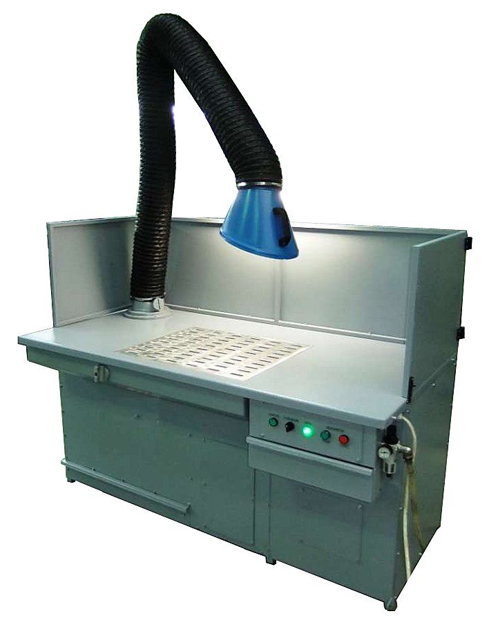 - стол – 1 шт.; - поворотно-вытяжное устройство – 1 шт.; - предварительный фильтр грубой очистки – 1 шт.; - фильтрующий картридж тонкой очистки – 1 шт.; - вентилятор – 1 шт.; - влагомаслоотделитель – 1 шт.; - манометр фильтра влагомаслоотделителя с регулятором давления – 1 шт.; - лампа освещения люминесцентная – 1 шт.; - штора защитная – 1 шт.; - металлический пылесборник – 1 шт.; - механизм импульсной продувки фильтров сжатым воздухом – 1 шт.; - пульт управления регенерацией (ПУР) – 1 шт. |