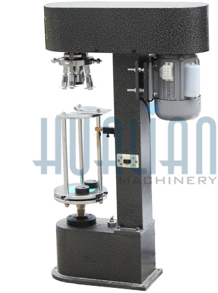 Полуавтоматическая машина для укупорки (закручивания) металлического колпачка на стеклянную бутылку. Данная машинка представляет собой простой станок, состоящий из регулируемой подставки с упором для бутылки, электропривод, завинчивающая головка. Аппарат предназначен для накручивания металлического колпачка (со стопорным кольцом) на горлышко при этом надавливая резьбу в соответствие с рисунком винта горлышка бутылки. Процесс завинчивания 3-5 секунд, при необходимости можно прогнать по второму кругу.