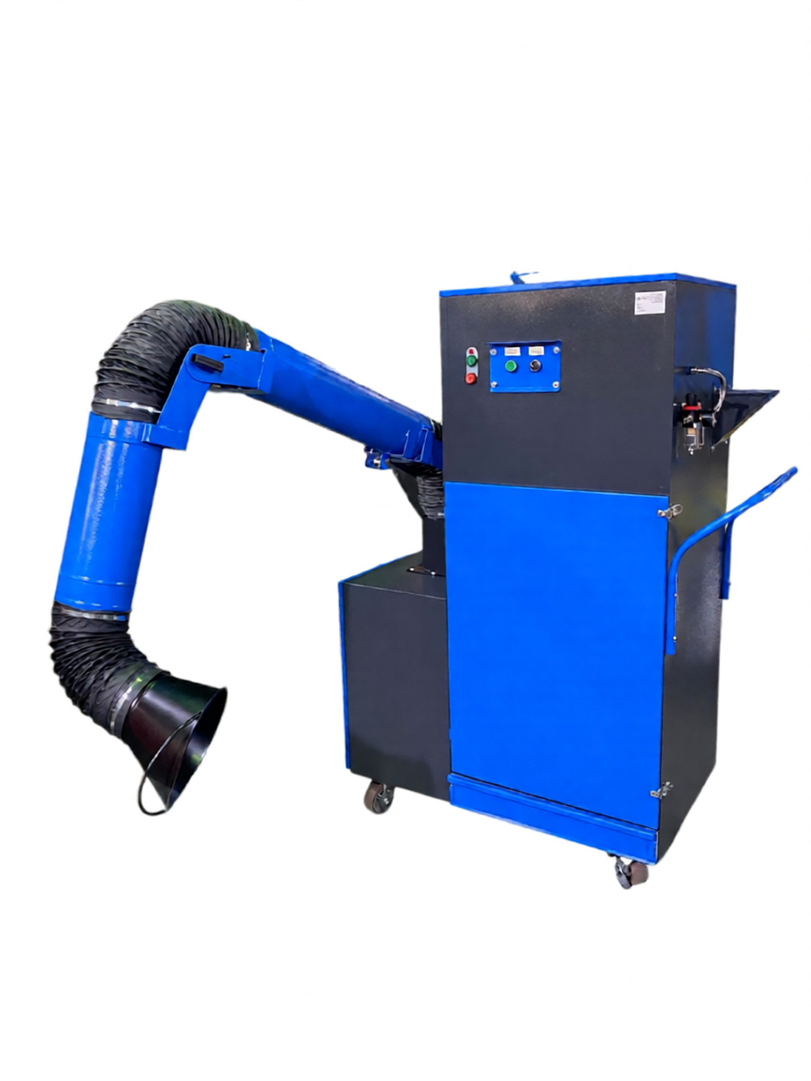 Установленное подъемно-поворотное вытяжное устройство позволяет производить забор мелкодисперсной пыли из зоны проведения сварочных работ в радиусе 2 м от установки. ПВУ поворачивается на 360 градусов вокруг своей оси, легко перемещается и фиксируется в нужном положении. Воздухоприемная воронка данного устройства вращается в нужную сторону на 110 градусов от оси в любой плоскости.
