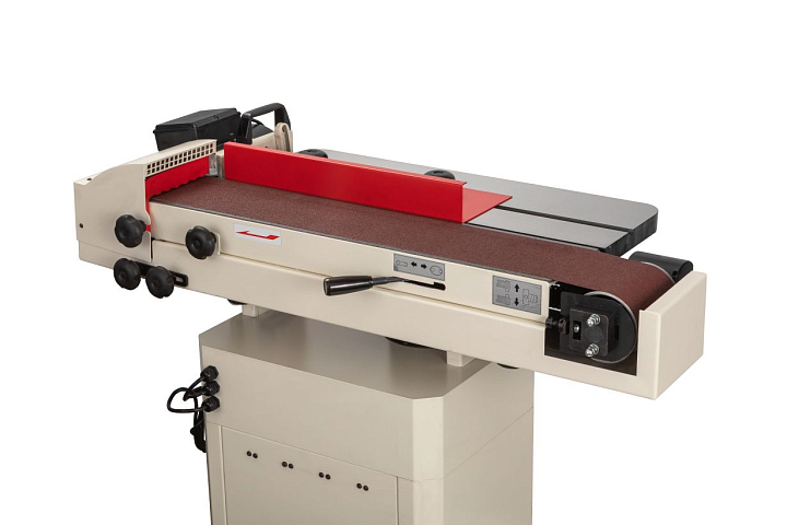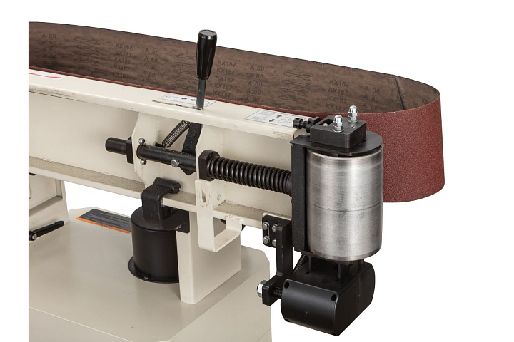 Модель оснащена вспомогательным механизмом, который за счет поворота узла переднего натяжного ролика обеспечивает колебания ленты в направлении перпендикулярном основному движению. Осцилляция способствует более эффективной работе абразива и повышает производительность станка.