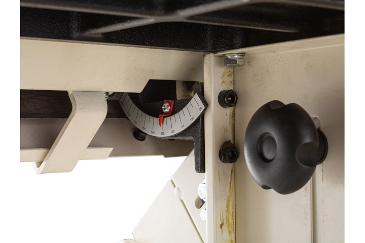 Шлифовальный узел станка выполнен поворотным вокруг продольной оси, его можно установить вертикально, горизонтально или под любым промежуточным углом, фиксация выбранного положения производится эксцентриковой рукояткой без использования инструмента. Основной рабочий стол, сделанный из литого чугуна, регулируется по высоте, что позволяет выровнять его поверхность с плоскостью ленты при её горизонтальном положении или использовать ресурс всей её ширины при эксплуатации в вертикальном. Для фиксации заготовки предусмотрены длинный «параллельный» упор с фиксацией в Т-образном пазу и подвижный угловой.