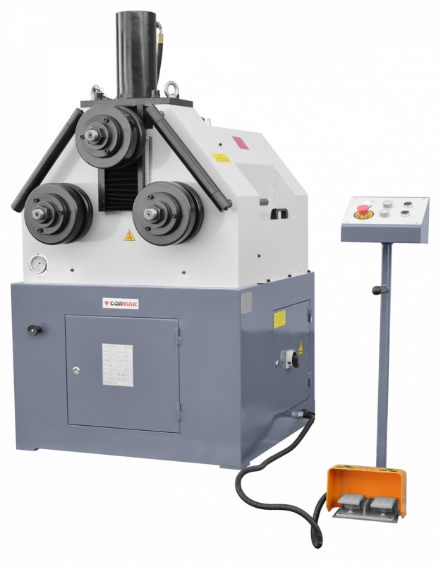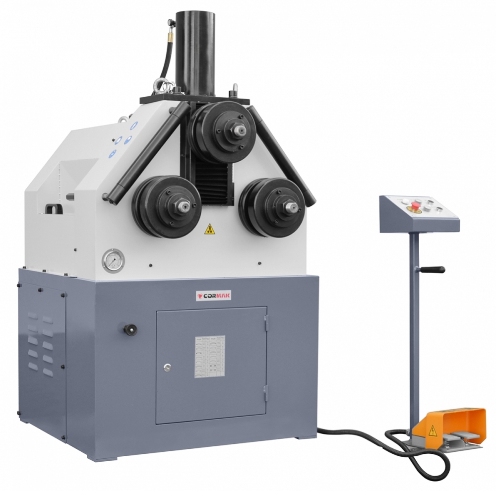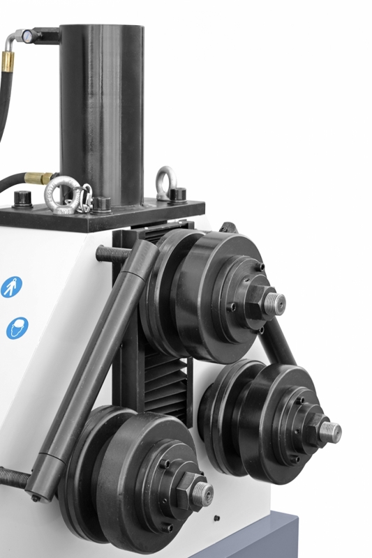 Обе оси гибочного станка приводятся в движение при помощи сильного гидравлического двигателя, тогда как верхнее колесо поднимается с помощью гидравлического цилиндра оси.