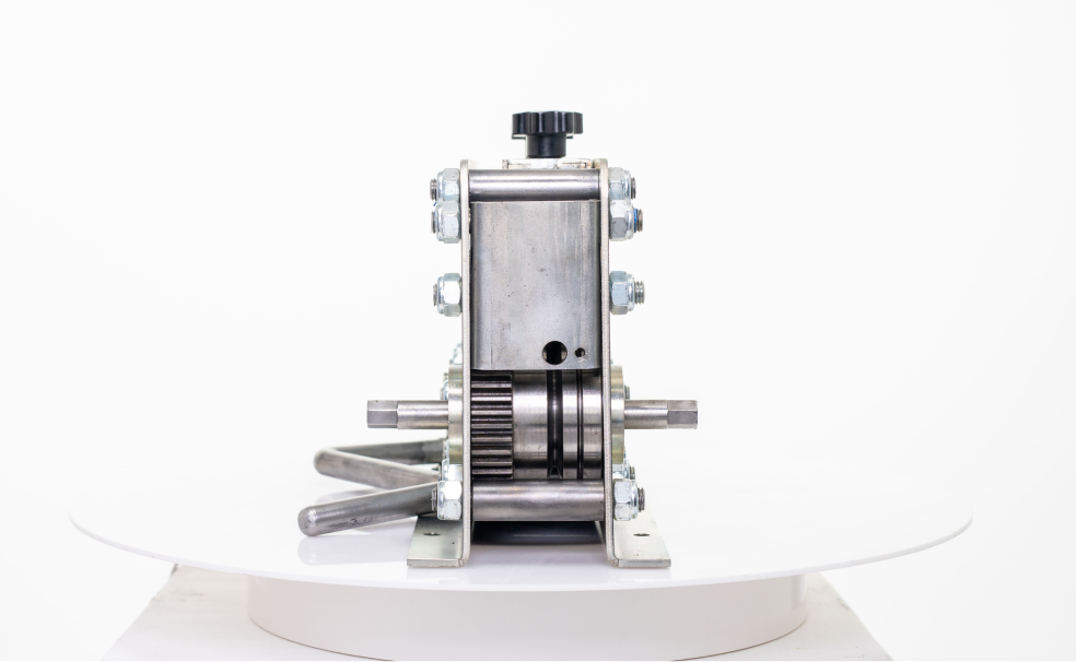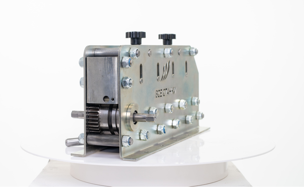 Устройство оснащено девятью роликами. Правильные ролики закалены, что увеличивает срок службы оборудования. Все ролики установлены на закрытые шариковые подшипники, не требующие смазки. Благодаря замкнутой подвижной системе, ролики приводятся в движение одновременно, обеспечивая отличную управляемость устройством, что предотвращает замятие или царапины на поверхности проволоки и полосы. Перед началом работы, устройство должно быть закреплено к плоской горизонтальной поверхности с помощью десяти болтов или винтов.