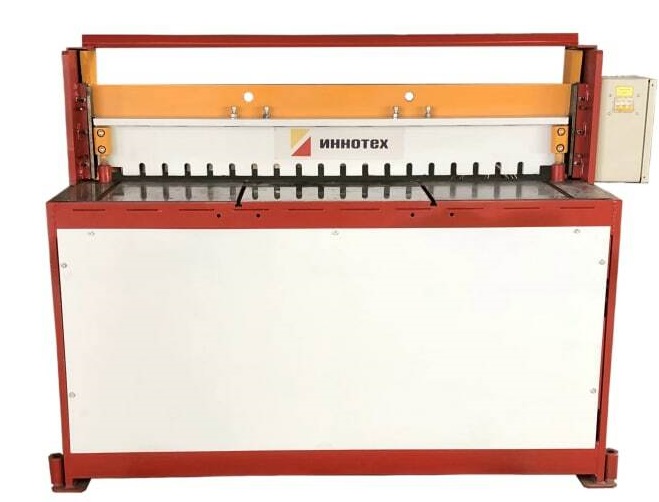 Гильотина для металла оснащена: тыльным упором; нержавеющей отделкой стола с гравировкой размерных шкал; полимерной окантовкой прижимной планки; педалью с металлическим кожухом; станочным светильником