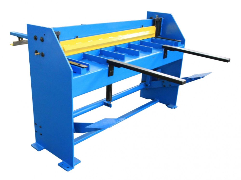 Подъем балки с верхним ножом осуществляется пружинами. Простота конструкции обеспечивает долговечность и неприхотливость станка. Для более точного расположения листа на рабочем столе станка, предусмотрены передние поддерживающие штанги, по которым перемещается передний упор. Этот элемент удобно использовать при подаче полосы листа из рулона в гильотину с тыльной стороны.