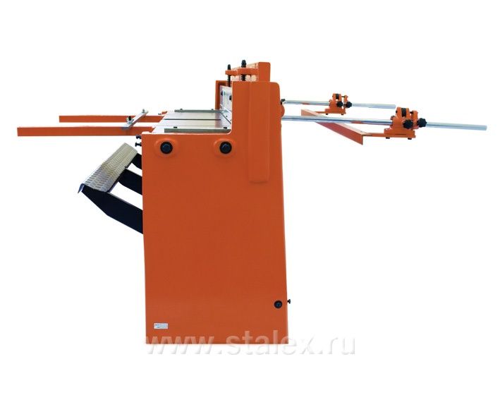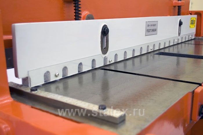 Модель оснащена резаками из высокоуглеродистой стали и механизмом надежного прижима листа. Гильотина имеет ограничитель глубины подачи заготовки и ножную педаль с простым регулятором положения.