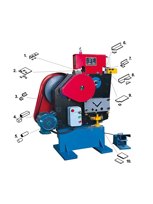 Станок выполняет резку, пробивку, вырубку и гибку, заменяя несколько отдельных устройств, что повышает эффективность работы.