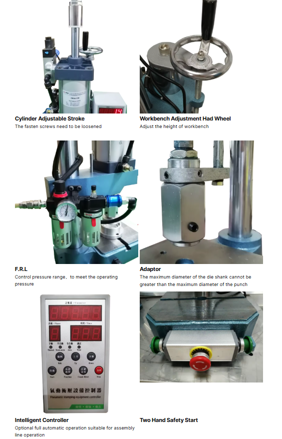 Этот пневмогидравлический пресс обеспечивает диапазон давления от 0,3 до 0,8 МПа и максимальную теоретическую производительность 15 кН. Он отличается простотой регулировки с помощью воздушного давления, высокой точностью и адаптивностью для точных ударных нагрузок. Машина поддерживает ручные, полуавтоматические и автоматические операции и включает системы безопасности, такие как кнопки двухкнопочного запуска и защиты от перегрузки.