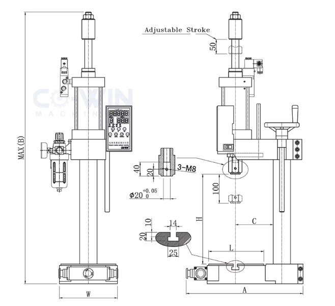 Этот пневмогидравлический пресс обеспечивает диапазон давления от 0,3 до 0,8 МПа и максимальную теоретическую производительность 15 кН. Он отличается простотой регулировки с помощью воздушного давления, высокой точностью и адаптивностью для точных ударных нагрузок. Машина поддерживает ручные, полуавтоматические и автоматические операции и включает системы безопасности, такие как кнопки двухкнопочного запуска и защиты от перегрузки.
