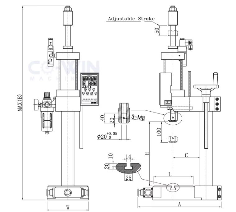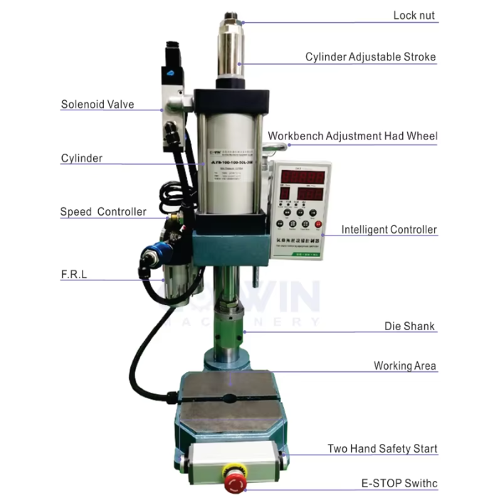 Этот пневмогидравлический пресс обеспечивает диапазон давления от 0,3 до 0,8 МПа и максимальную теоретическую производительность 15 кН. Он отличается простотой регулировки с помощью воздушного давления, высокой точностью и адаптивностью для точных ударных нагрузок. Машина поддерживает ручные, полуавтоматические и автоматические операции и включает системы безопасности, такие как кнопки двухкнопочного запуска и защиты от перегрузки.