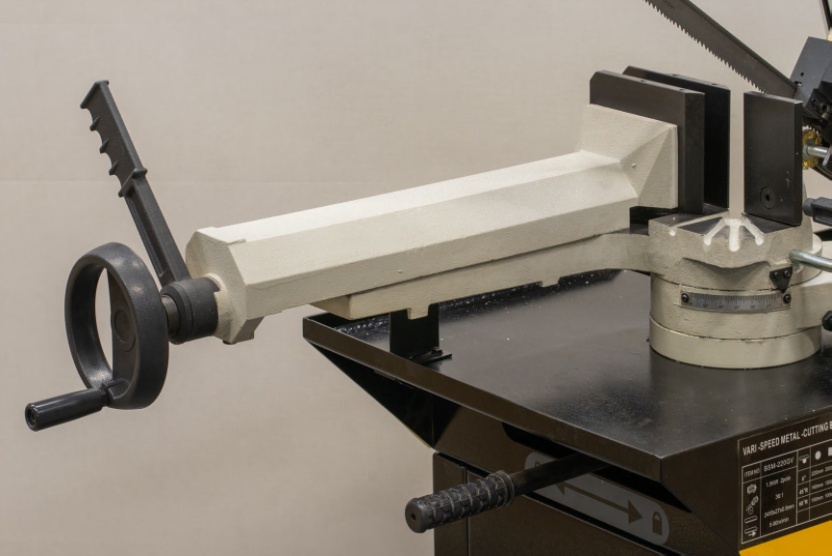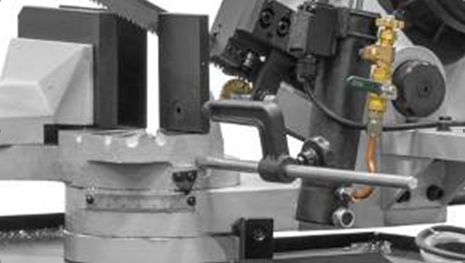 Модель имеет быстрорегулируемые тиски для резки под углом, поворачивается рама, а не заготовка. Тиски с системой быстрого отвода ускоряют процесс смены заготовки (ускоренный отвод подвижной губки происходит без вращения маховика). Зажим заготовки осуществляется тисками вручную, подача заготовки - также вручную. Наличие системы СОЖ в стандартной комплектации – позволяет добиться высокой производительности.