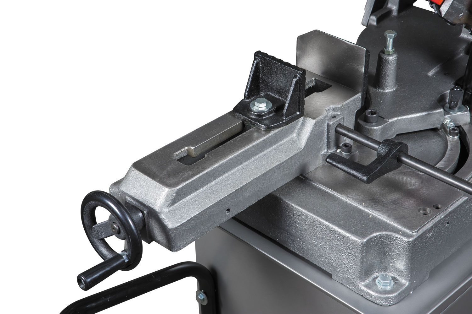 Модель имеет направляющие, передвижение которые по раме регулирует проход ленточного полотна и качество распила. С целью повышения точности распила, позиционирование полотна в вертикальном положении обеспечивается подшипниками, установленными в направляющих. Пиление заготовок требует использование СОЖ, подача, которой в зону резания осуществляется вручную. Модель имеет систему автоматической остановки двигателя, которая срабатывает по окончанию распила заготовки.