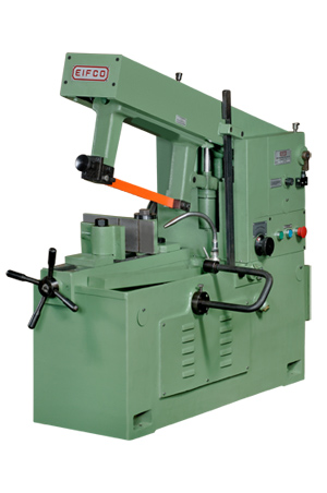 Моторизованная модель электроножовки Eifco. Он оснащен устройством контроля подачи, автоматическим подъемом и опусканием пильной рамы с механическим насосом охлаждающей жидкости, тисками и защитой ремня станка.