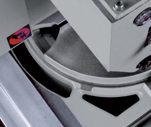- Поворотный стол с центрирующим штифтом, установленный на упорном подшипнике, обеспечивающем высокую точность установки угла резания.
