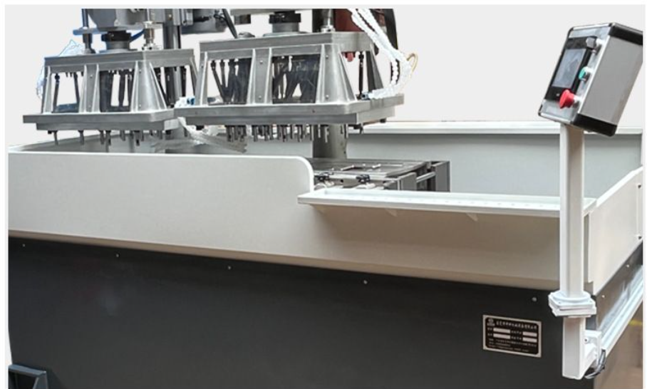 Это многоосевой автоматический резьбонарезной станок с сервоприводным перемещением стола. В станке используются две многоосевые головки 651 6 с вставными пластинами размером 300*500 мм. Для двух разных шагов резьбы, где невозможно одновременно перемещать отверстия, используются два основных блока и два комплекта многоосевых головок. Многоосевые головки с вставными пластинами являются съемными и многоразовыми, что позволяет одновременно нарезать резьбу с разным шагом.