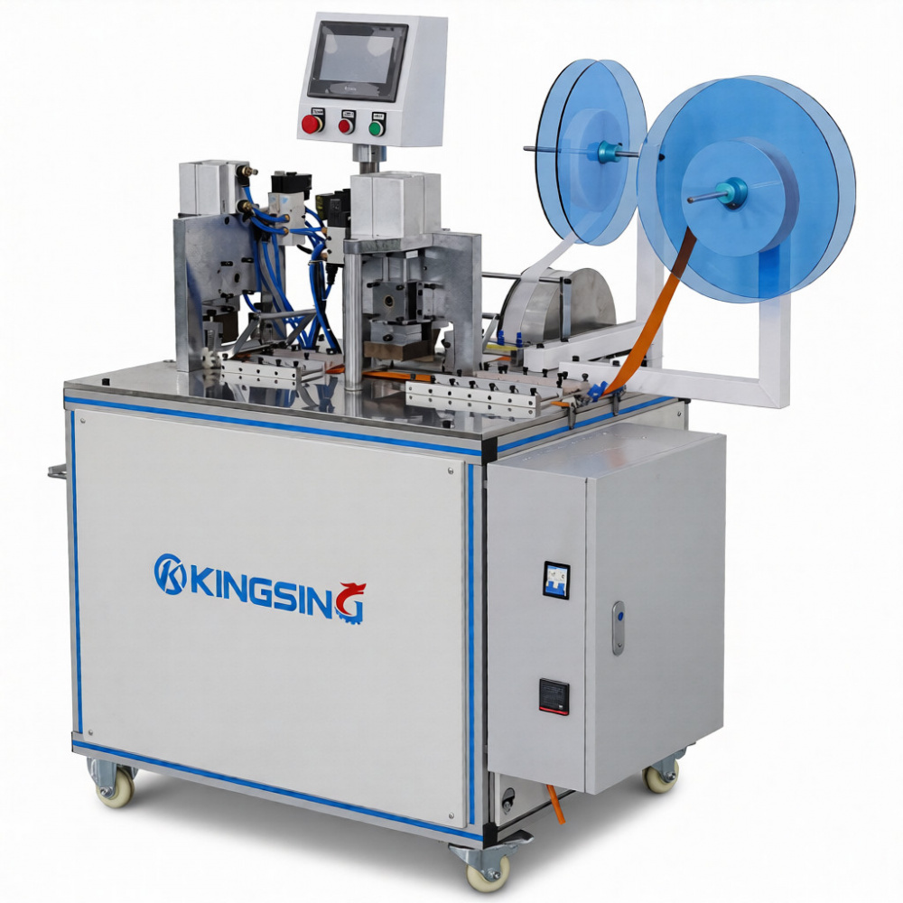 Это ультразвуковой станок для резки и сварки лент, позволяющий одновременно работать с тремя видами лент: базовой лентой и лентами-липучками. Ленты-липучки автоматически разрезаются на мелкие кусочки, которые затем привариваются к лицевой и обратной сторонам базового слоя.