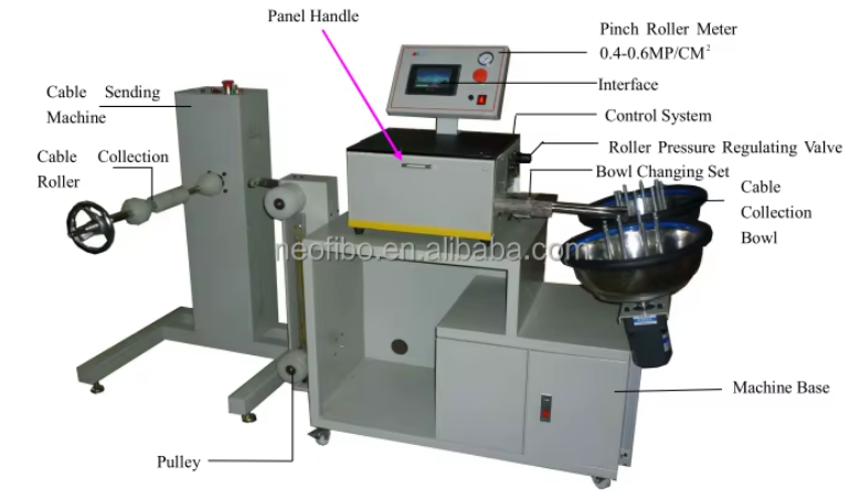 Машина для резки оптического волокна обладает высокой степенью автоматизации – от стадии запуска необработанного кабеля до конечной намотки. Высокая точность длины достигается наличием измерительного колеса для подсчета, предотвращения отклонений и скручивания кабеля, скольжения во время подачи. Две приемных чаши принимают отрезки поочередно, что делает процесс непрерывным. Печать кода – опция.