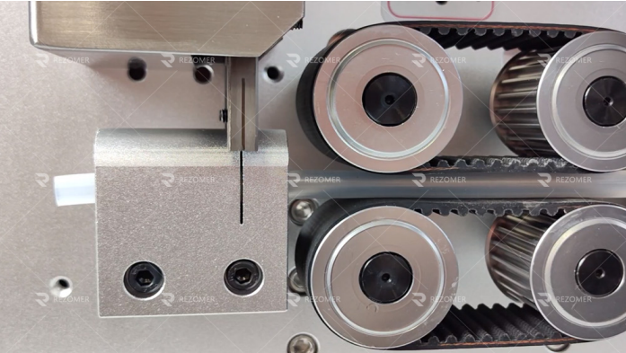Продвижение материала двумя лентами. Расстояние между лентами регулируется.