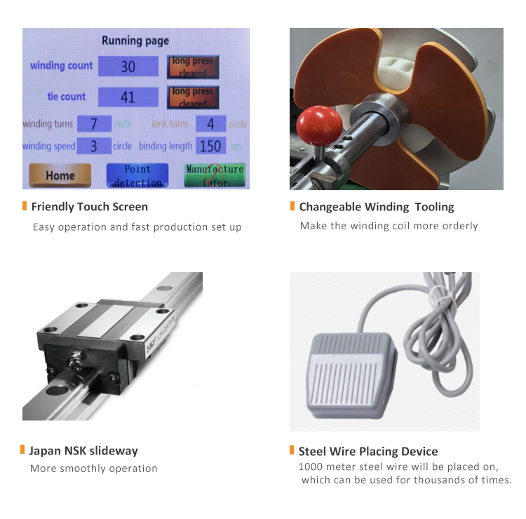 • Сотрудники просто помещают провода в порт, который он автоматически наматывает, затем помещают эти провода вокруг устья норвежской проволоки, машина автоматически выполняет норвежскую обмотку. Машина может устанавливать длину обвязочной проволоки и количество витков, подсчитывать выход.