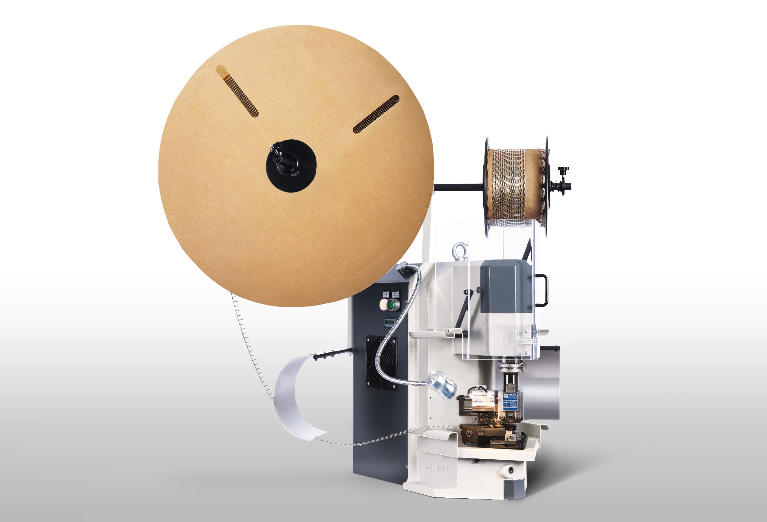 Пресс серийно оснащен сбрасываемым счетчиком опрессовок, светодиодной лампой для освещения рабочей зоны и двумя кронштейнами - держателями катушки с контактами для уменьшения временных потерь при настройке пресса под контакты с разным типом подачи.