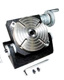 Стол поворотный наклоняемый предназначен для применения на фрезерных и сверлильных станках как дополнительная технологическая оснастка. Поворотный наклоняемый стол незаменим при фрезеровании поверхностей различного профиля расположенных под углом, изготовления и обработки отверстий, и других металлообрабатывающих работ с технологическим требованием выполнения одной операцией, без переустановки обрабатываемой детали. Поворотный стол имеет возможность наклона от 0° до 90°, где в последнем случае при обработке некоторых типоразмеров деталей рекомендуется применение задней бабки с регулируемым наклоном пиноли и изменяемой высотой центра от основания. Диаметр стола 150мм.