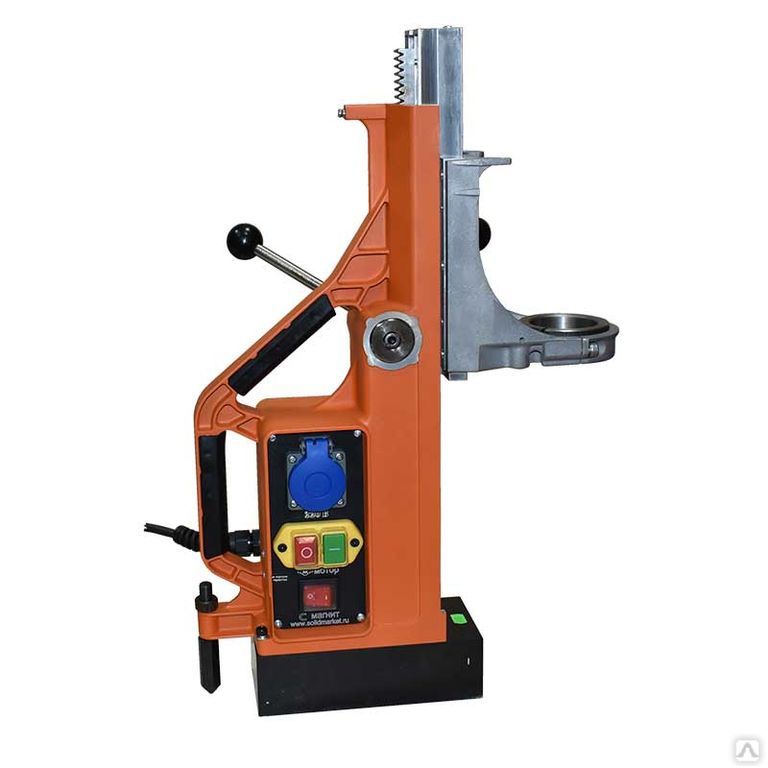 Облегчает работу на высоте, сверление больших отверстий, в том числе коронкой, в вертикальных стенках и над головой. Для безопасности работы, питание на розетку, встроенную в станину, поступает только после активации электромагнита. На случай прерывания подачи электричества, стойка должна быть закреплена страховочным ремнём (входит в комплект поставки).